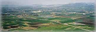 | カルメル山からエズレル平原を見下ろす. カルメル山は、地中海に突き出た半島から伸びた山脈より構成され、北側にエズレル平原が広がっている。旧約聖書 列王記上に、エリヤ一人とバアルの預言者450人が、エリヤの信じる主(エホバ)の神か、偶像のバアルの神かのどちらが、「真の神」か戦いをした場所。 写真の左上に蛇行した所に、小さなキション川が有る(ワジがあるところに木が生えている)。雨が降るとこの一面水浸しになったと言う記事がある。 |