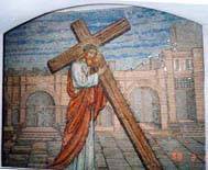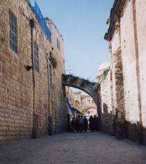 イエスさまが、十字架を背負って歩かれた道(約1km) 1留〜14留に記念のものが掲げられている。 1留:アントニア要塞 2留:鞭打ち教会 3留:アルメリア・カトリックが所有(下写真) 4留:苦悩の母マリアの教会(アルメニア人) 5留:キレネ人シモンがイエスに代わって十字架を 背負った 『そこへ、アレクサンドロとルフォスとの父でシモンというキレネ人が、田舎から出て来て通りかかったので、兵士たちはイエスの十字架を無理に担がせた。』 (マルコ15:21) 6留:ベロニカの教会 7留:審きの門があった。 8留: セイハラランボス・ギリシア聖教の修道院 (ルカ:23:27-31 右→) 9留:聖墳墓コプト教会の入り口 10留〜14留:聖墳墓教会内 |