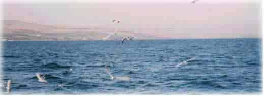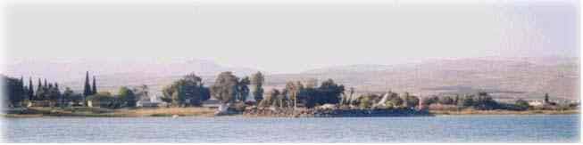 | カペナウム(北方) なだらかな岸辺、遠くにヘルモン山がある。かもめが船を追いかけてきた。2000年前もこのようであったのだろうか? |