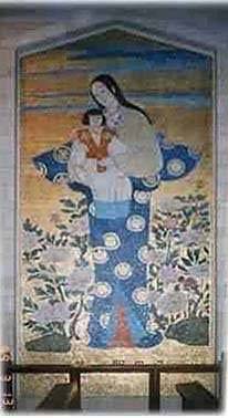 | 日本画各国の画家によるイエスの誕生の様子が招かれている。そのうちの日本画(ルカ長谷川の「華の聖母子」)は、少し考えさせられる。 |
