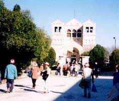 | バスを降り、タクシーに分乗し、タボル山に登る。山の上は観光客(アメリカ)でごった返していた。 山の後ろ側が開けたところで、(強い風の中)讃美、礼拝をした。 |