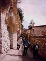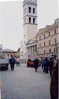 十字軍に入って、手柄を立てて騎士になりたかったようです。アッシジの日本人司教から、フランチェスコの生涯について説明があった。 博物館の内部の壁にいろいろな宗教画が掲げられていた。 食事はアッシジ市内のレストランで、イタリア・スパゲッティだった。水は別途注文、2000リラ(日本円で150円程度) 市内の広場から、ドイツ車のエステマ風タクシー(8人乗り)3台に分乗し、細い市内の道(車一台がやっと通れる幅)を通って、(車は右側通行で乗っていて変な気分だった。)訪れた施設。パウロ寺院、聖クララ寺院、二階がシスターの休息所 イエス・キリストによる救いが必要である。 3年前の地震で建物が破壊され、建物が石でできており地震に弱い構造で破壊を大きくした。見学できない建物が多かった。さらに2000年のキリスト降誕祭に向けての工事と修復とが重なり町中工事中だった。 |
