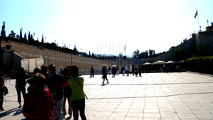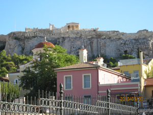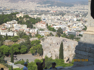 ![]() パルテノン神殿 丘の上に建てられた大きな建築物で、アテネ市内から眺めることができる。 |