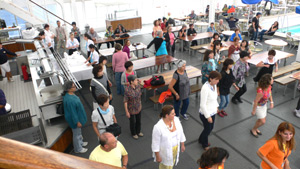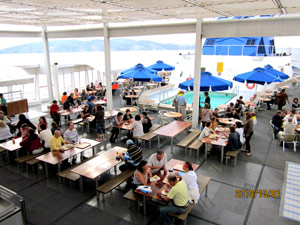 4階のレストランは、コース料理が食べられ、混んでいた。 5階は屋上レストランで、バイキング形式の食事で、好きなものを選んで食べることができた。どちらも、料金はクルーズ代に含まれています。 船内のイベントは、避難訓練、タオルアート、サルサダンス体験、ガラ・ショーなど乗客を飽きさせないイベントがいろいろあった。 そのほかに、いろいろな島に上陸して、ショッピング、古代遺跡観光などを楽しんだ |