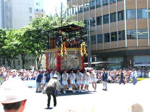 ![]() 長刀鉾の辻回し 何回もタイヤの下に竹を引き、水を撒いて、綱引きで方向展開していた。 |