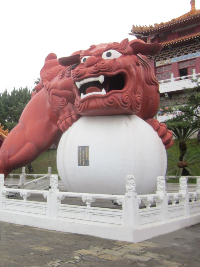 ![]() 赤い狛犬、玉遊び獅子 |
